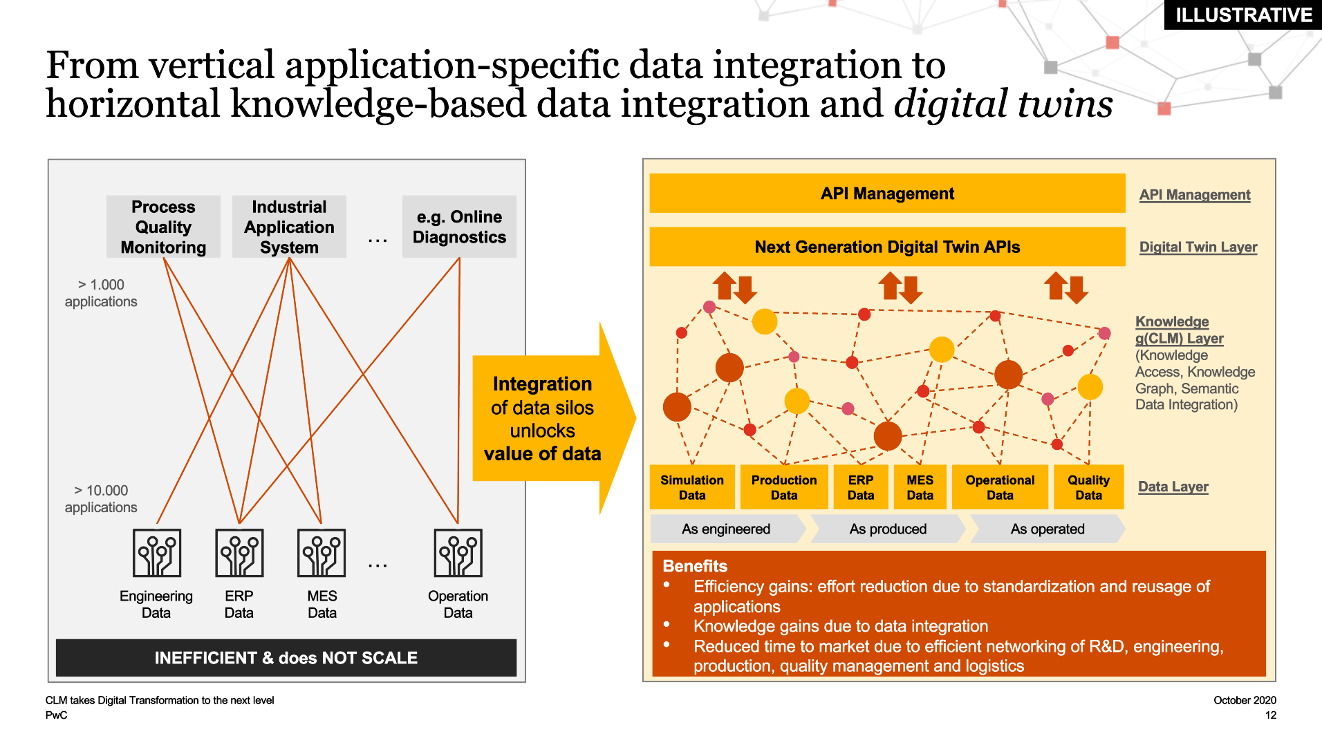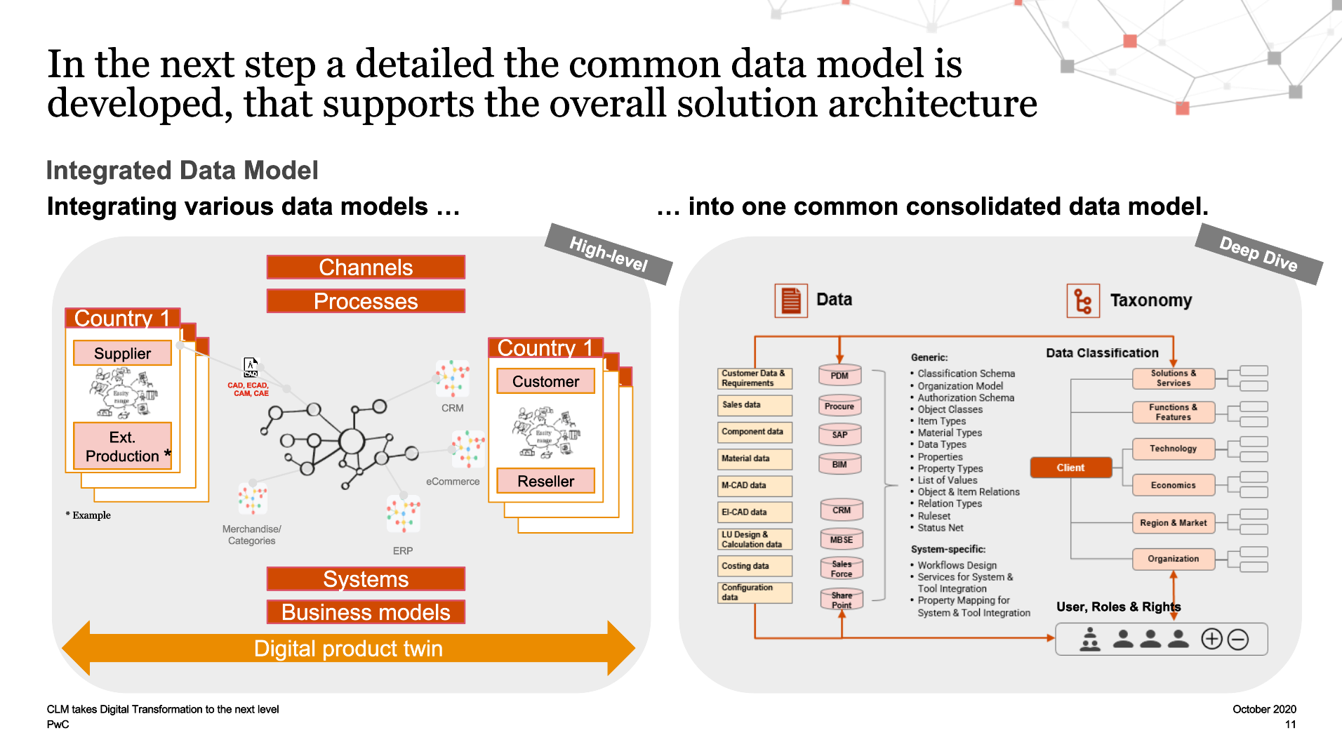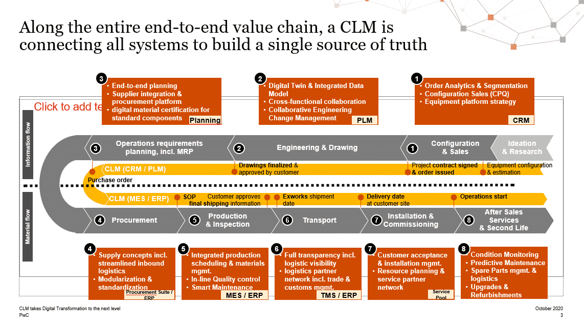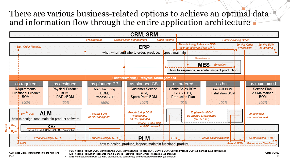 One of the challenges of supporting new digital products, services and flexible business models is that current company IT infrastructures are a mix of siloed system solutions developed to address very specific challenges, at different times, and in very different ways. Each of these systems was developed in a different era making it difficult to create a common integrated data model. For example, ERP systems, which are broadly used to manage manufacturing, logistics and pricing, were first developed in the 1990s, while PLM and CRM systems were developed in the 2000s to manage product engineering and sales respectively.