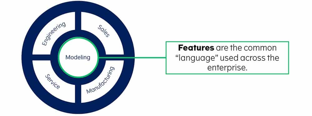 A key element of End-to-End Configuration is getting the functional areas of your organization to share the features of the product. These features become the key language in how you talk about the variability of a product; not so much the parts themselves and the individual part numbers, but more so the capabilities of the product. And in the center of this you have the modeling aspect, and this is what we will explain in a little more detail.