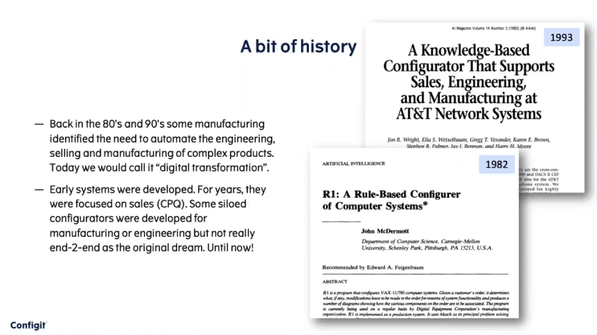However, this original dream of end-to-end configuration was challenged by the complexity of the task at hand, which required a great deal of resources and know-how, and was also constrained by the tools available at the time. Originating in the realm of artificial intelligence, the solutions were often difficult for others to understand and apply. This made widespread adoption of end-to-end configuration solutions difficult. Product configurators were mainly applied to specific applications, which were better understood, more readily implemented and justified, such as sales solutions like Configure Price Quote (CPQ) systems, but not for end-to-end configuration. Until now.