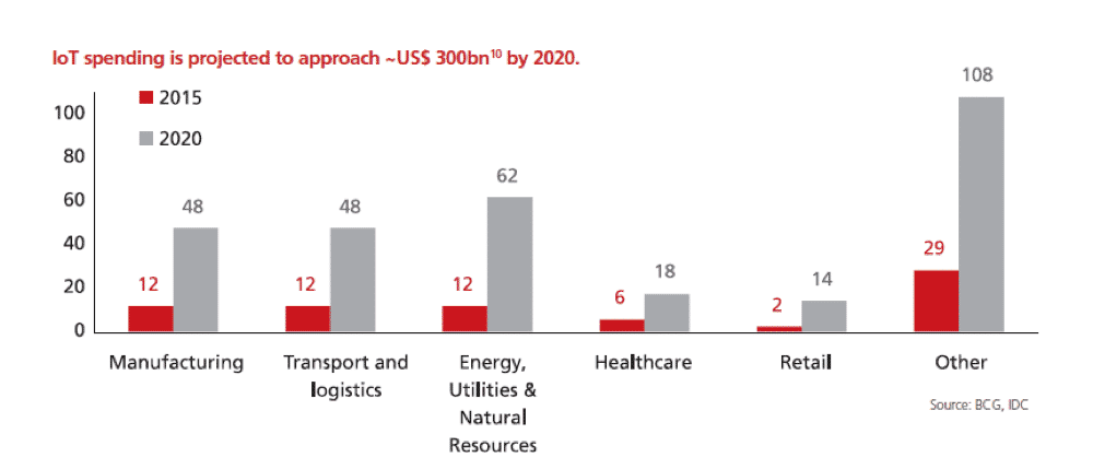 - By 2020, 50% of IoT spending will be driven by discrete manufacturing, transportation, and logistics, and utilities according Boston Consulting Group.