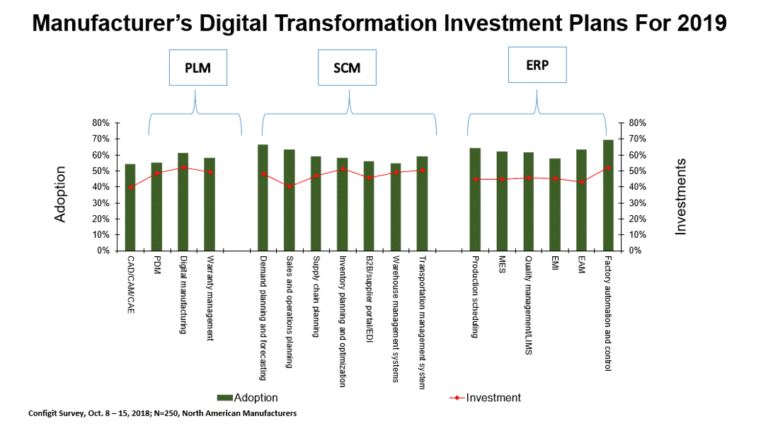 - Manufacturers growing 10% a year or more excel at orchestrating PLM, CAD, ERP, and CRM, digitally transforming how products are defined, built, sold and serviced.