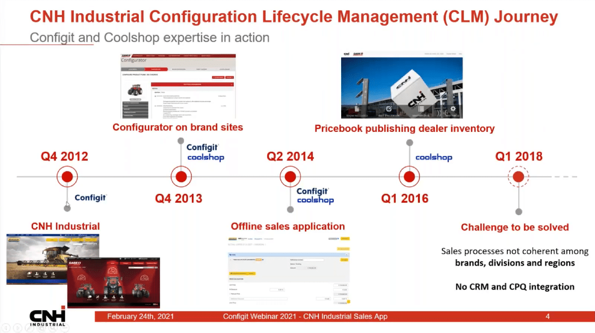 The next phase in the journey was to enrich the available solutions with more information on the products and more guidance to the sales team and dealer network. Leveraging the CLM solution, it was also possible to create an inventory of product related information including offline price-books that could be downloaded to devices. This took two years to complete, but provided the inspiration for the latest phase focused on providing a more coherent sales process across multiple brands, divisions and regions that could leverage integration of CRM and CPQ solutions.