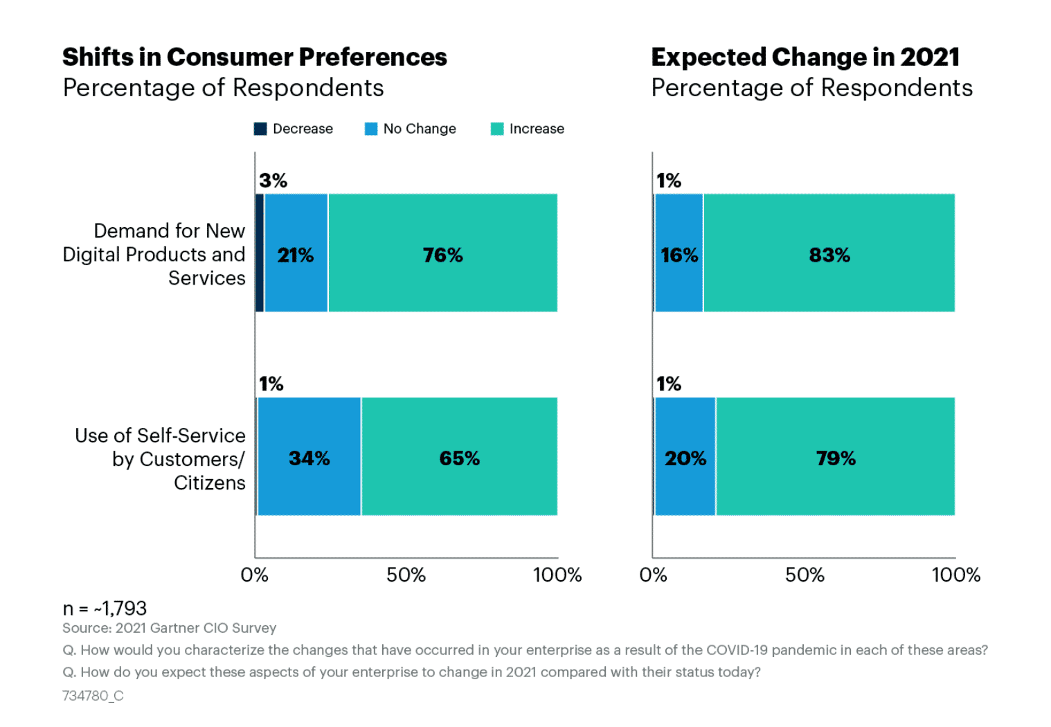 A recent Gartner report[2] states 76% percent of CIOs reported increased demand for new digital products [3] and services as a result of COVID-19 and 83% expect that to increase further in 2021, according to the Gartner CIO Agenda 2021. Along the same line, 65% of CIOs saw an increase in the use of self-service by customers/citizens, and 79% expect that usage to grow in 2021.